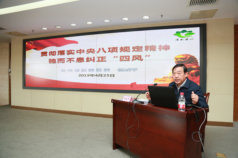 为深入贯彻落实中央八项规定精神,扎实推进医院党风廉政建设,4月25日下午,院党委邀请扬州市纪委监委杨成平主任来我院为党员干部职工开授《贯彻落实中央八项规定精神,驰而不息纠正“四风”》专题党课,党课由院党委委员、副院长束余声主持,院领导、各党总支书记、支部书记、临床医技科主任、护士长、职能部门负责人及党员代表近400余人参会,专题党课主会场及分会场同时进行。