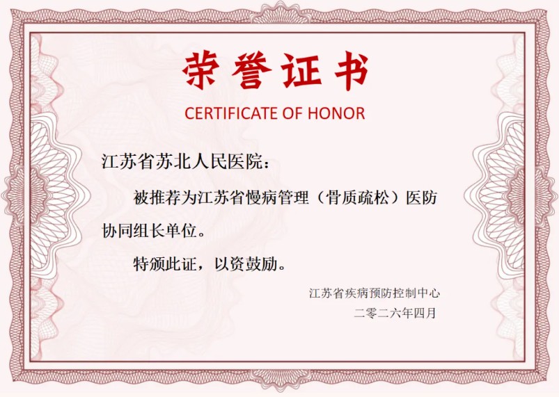 我院被授予江苏省慢病管理(骨质疏松)医防协同组长单位