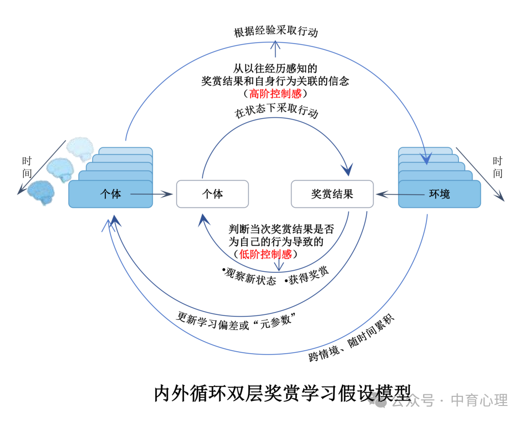 如果问题出在“大脑学不会从奖励中更新信息”,那么一个自然而然的问题就浮现出来了:这个过程,能不能被改变呢? 如图所示,根据我们的研究假设,人的奖赏学习包含两个层次: 内循环(短期):是基于当下的反馈来调整行为。就像在玩游戏时,根据匹配到的队友与对手表现,来决定下一局是大胆进攻还是谨慎防守。 外循环(长期):是基于跨情境的经验形成一种信念,比如“谋事在人,成事在天”或者“得过且过,顺其自然”。在缺乏反馈时,人们倾向于按照已有的“默认模式”采取行动。